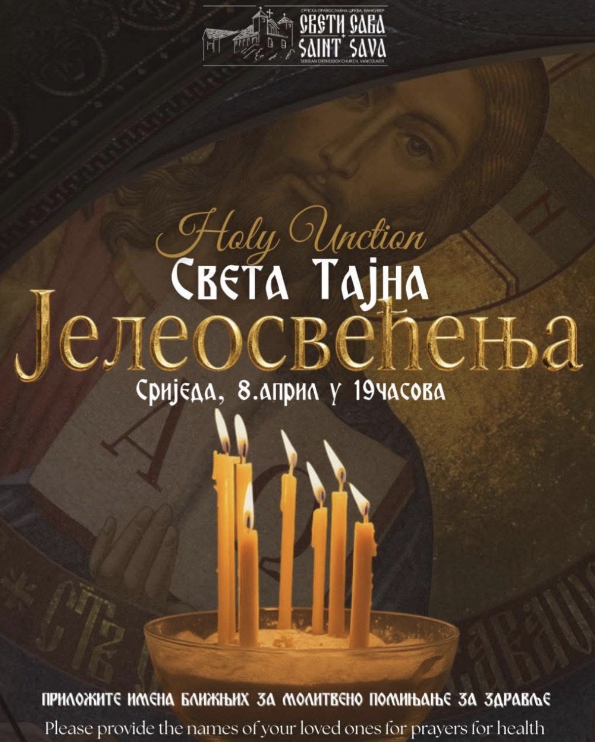 19ч Св. Тајна Јелеосвећења (имена за здравље вас и ваших ближњих можете оставити у цркви до почетка службе)